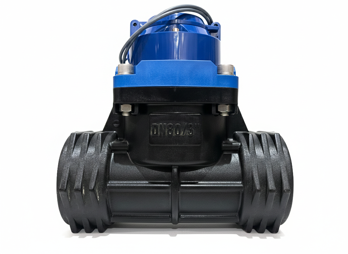Mede o fluxo de água em sistemas de irrigação, com rosca DN80, corpo plástico resistente e emissor de pulso para automação e monitoramento eficiente.